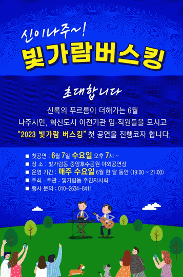 채성군 빛가람동 주민자치회장은 “지난 해 ‘흥이 나주~!’에 이어 올해는 ‘신이나주~!’라는 테마로 빛가람 버스킹을 추진한다”며 “코로나19로부터 완연한 일상회복에 맞춰 그동안 힘들고 지쳤던 시민, 공공기관 임직원, 소상공인들이 활력을 얻고 버스커들에게는 멋진 공연을 펼칠 수 있는 기회의 장이 되길 바란다”고 밝혔다.