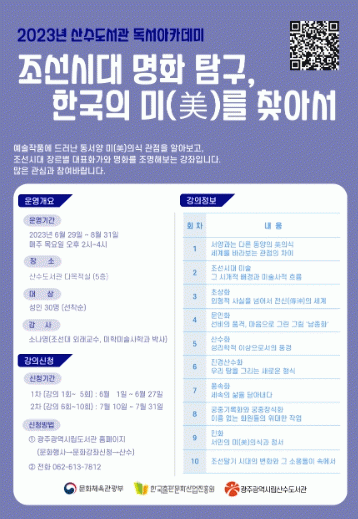 박민정 산수도서관 관리장은 “독서아카데미를 통해 서양과는 다른 우리나라 미술의 가치를 발견할 수 있을 것이다”며 “많은 시민의 관심과 참여를 부탁드린다”고 말했다.