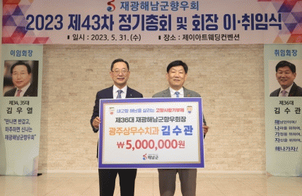 김 회장은 지난달 31일 재광해남군향우회 신임 회장에 취임, 취임식을 통해 고향사랑기부금을 기탁했다.