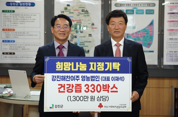 이날 기탁된 1,300만 원 상당의 건강즙은 강진군 노인 요양 및 재가시설 13개소에 전달될 예정이다.