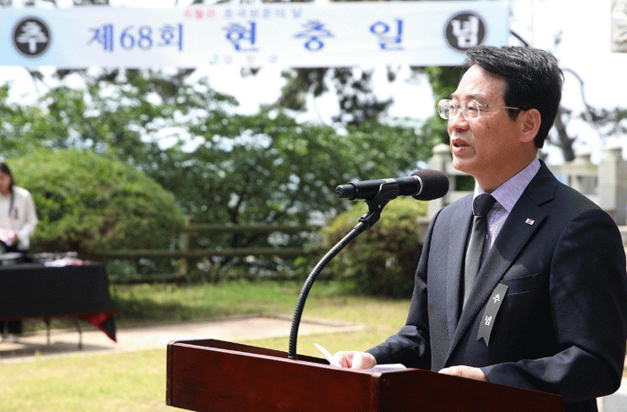 오전 10시 정각, 전국적으로 울리는 사이렌에 맞춰 1분간 순국선열과 호국영령에 대한 묵념을 시작으로 헌화와 분향, 모범 보훈대상자 표창, 추념사, 헌시 낭송, 다시 부르는 영웅 Roll Call, 현충일의 노래 제창 순으로 진행됐다.