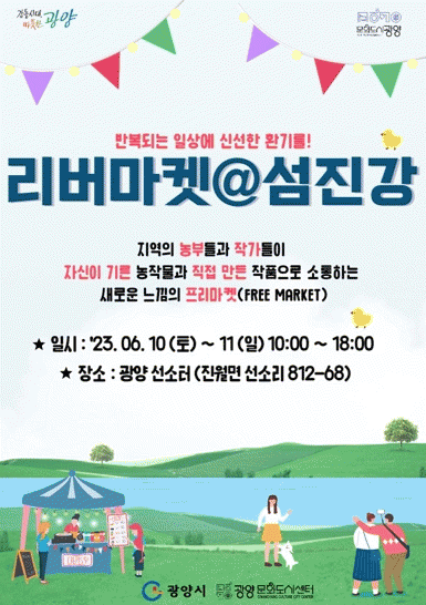 한편, 리버마켓@섬진강은 6월 이후 오는 7월, 8월, 10월에도 개최될 예정이다. 매월 ‘리버마켓@섬진강’ 셀러를 위한 기본교육과 행사 참여를 위한 셀러 모집이 상시 진행되고 있으니, 관심 있는 시민은 광양문화도시센터로 문의하면 된다.