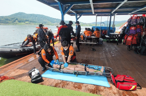 이날 훈련에서는 수난사고 발생을 가정해 소방헬기와 보트를 이용한 신속한 인명구조와 각종 수난장비 조작·숙달을 통한 수중 적응훈련을 실시했다.