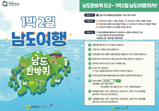 조대정 전남도 관광과장은 “남도한바퀴가 당일 여행상품만 운영해 원거리·체류형 관광객 유치에는 한계가 있었다”며 “전남 곳곳의 빼어난 관광지와 음식 등 알차게 준비한 1박 2일 상품을 통해 힐링관광 중심지로 떠오르는 전남에서 추억여행을 즐기길 바란다”고 말했다.