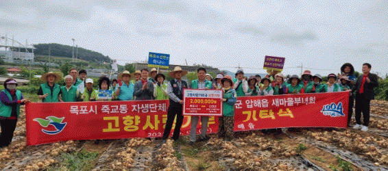 신안·목포지역 상호교류 활성화와 고향사랑 실천에 앞장서기 위하여 목포시 죽교동 자생단체연합회원 20명과 압해읍 새마을 부녀회원 10명이 참여하여 지병으로 투병 중인 김씨의 농가 양파 2,640㎡를 수확했다. 또한, 이날 현장에서 고향사랑기부금 1백만 원을 상호기탁하며 고향사랑 실천에 앞장서기로 다짐했다.