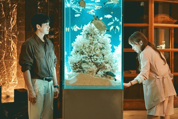 그 순간 고개를 드는 신혜선과 건너에서 수족관을 바라보고 있던 안보현의 눈길이 마주쳐 보는 이의 심장을 떨리게 한다. 두 사람은 서로를 빤히 바라보고 있는데 고요하고 평화로운 수족관의 분위기와 두 사람의 로맨틱한 모습이 보는 이의 마음마저 훈훈하게 덥힌다.