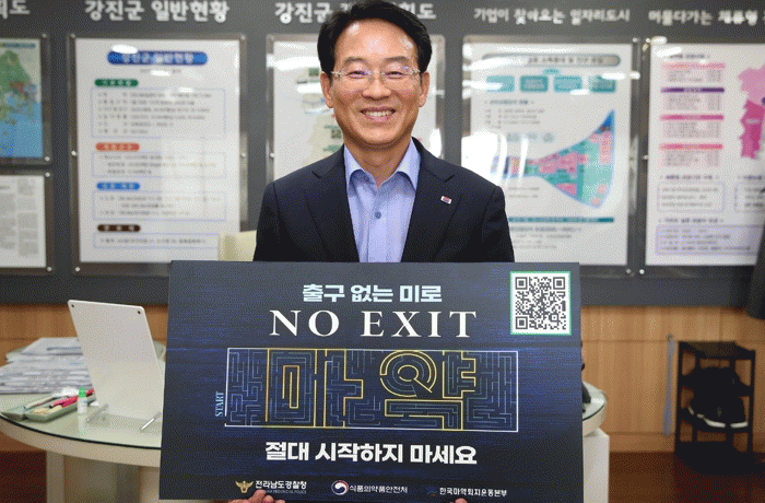 강진원 군수는 지난 7일, ‘출구 없는 미로 마약 절대 시작하지 마세요’라고 쓰여진 팻말을 들고 경찰청과 식품의약품안전처, 한국마약퇴치운동본부가 진행하는 마약범죄 근절을 위한 릴레이 캠페인에 참여했다.