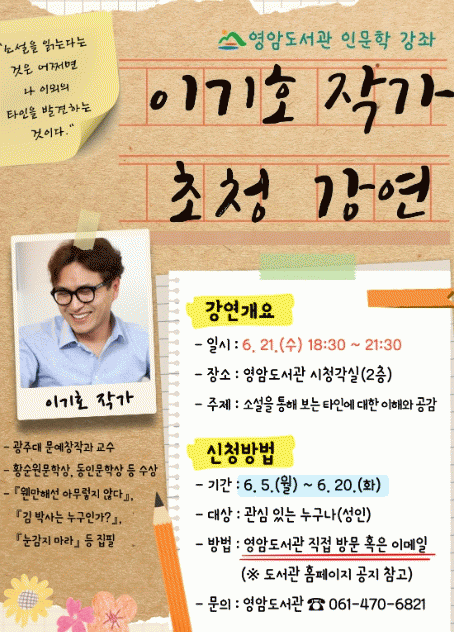 영암도서관 관계자는 “이번 강연으로 책과 사람에 대한 이해·공감의 지평이 넓어지고, 영암군이 책 읽는 인문학 도시로 나아가길 바란다.”고 밝혔다.