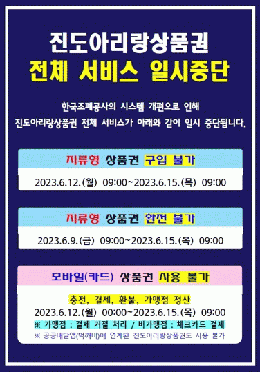 진도군 경제에너지과 관계자는 “이번 서비스 개편은 그동안 불편했던 기능을 보완하고 안정적인 상품권 서비스 개선을 위한 조치인 만큼 불편하더라고 군민들의 이해와 협조를 부탁드린다”고 밝혔다.