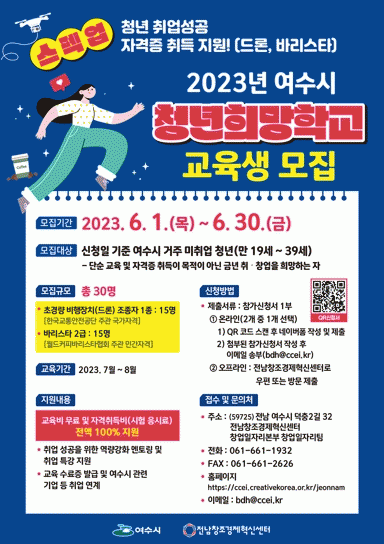신청대상은 여수시에 거주하는 만 19~39세 이하 미취업 청년으로, 오는 30일까지 전남창조경제혁신센터 이메일 우편.방문 중 하나로 신청하면 된다.