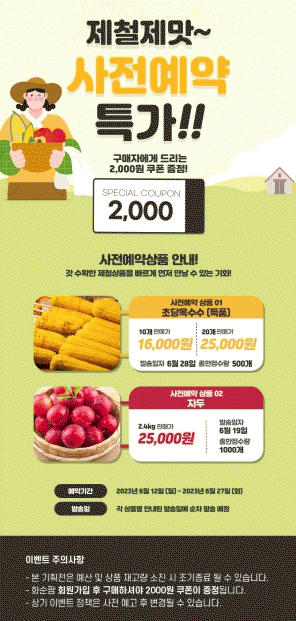 셋(사전 예약 특가), 6월 12일부터 28일까지 17일간 초당옥수수 500개(16,000원/10개, 25,000원/20개), 자두(2.4㎏/25,000원) 1,000박스를 사전 예약 특가로 판매한다.