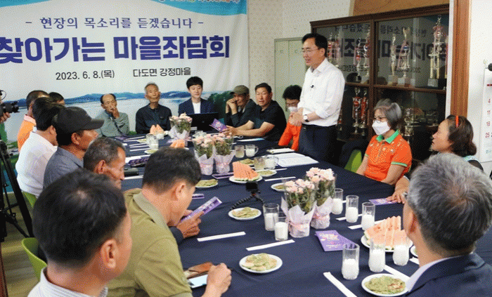 마을좌담회는 저녁 시간 마을회관, 경로당 등에서 격의 없는 대화 자리로 진행된다. 크고 작은 마을 현안, 건의 사항을 경청하고 이를 해소하기 위한 민선 8기 소통 시책이다.