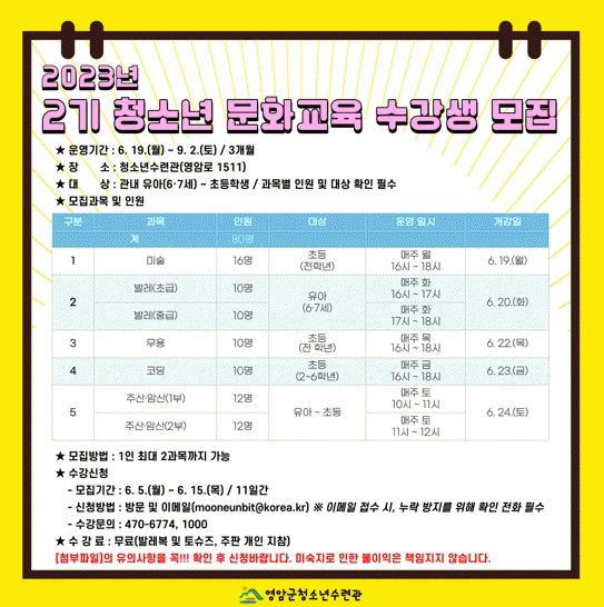 이달 15일까지 신청 접수를 받고, 모든 과목의 수강료는 무료다. 교육에 대한 자세한 내용은 영암군홈페이지 ‘고시공고’란을 보거나 청소년수련관으로 문의하면 안내한다.