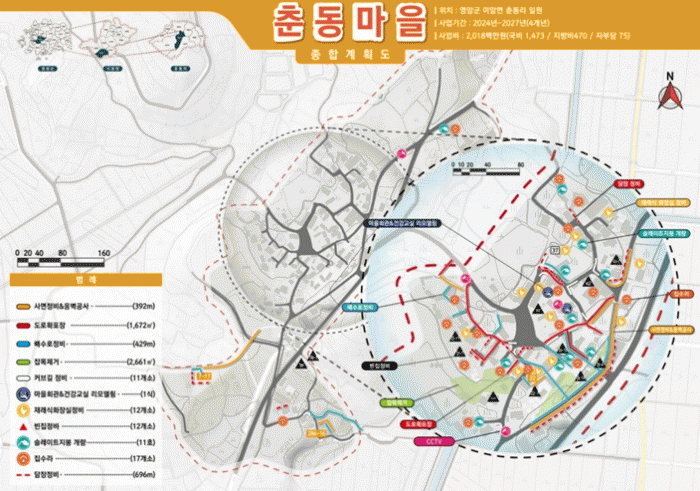 2023년 6월 현재, 50세대 83명의 주민이 살고있는 춘동마을에는 2027년까지 총사업비 20억 원을 들여 △마을안길 정비 △슬레이트 지붕 개량 △재래식 화장실 정비 등이 진행된다.