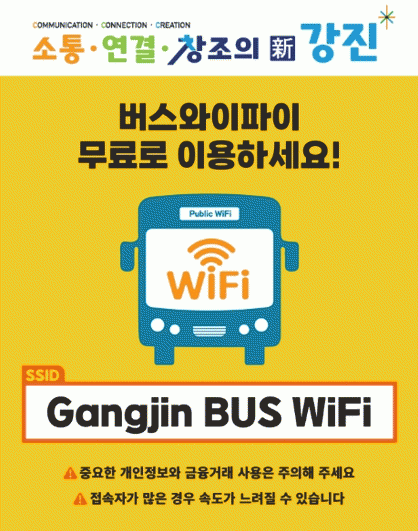 농어촌버스 안에서 탑승객 누구나 스마트폰 설정에서 ‘Gangjin BUS WIFI’를 선택하면 통신사와 관계없이 휴대폰, 태블릿, 노트북 등 모든 기기에서 무료로 인터넷 사용이 가능하다.