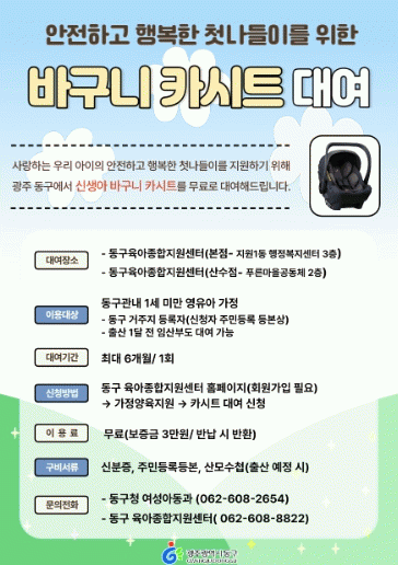 임택 동구청장은 “이번 사업을 통해 출산 가정의 고민을 함께 해결하는 ‘아이 낳아 키우기 좋은 행복 동구’를 실현하는 데 일조할 것으로 기대한다”면서 “해당 가정의 부모들은 경제적 부담을 줄이고 신생아들이 안전하게 차량 이동을 하는 데 도움을 주는 카시트 대여를 적극 활용하시기 바란다”고 말했다.
