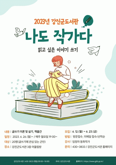 참여를 원하는 군민은 6월 23일까지 도서관에 방문하거나, 이메일로 신청서를 제출하면 되고, 자세한 사항은 강진군도서관으로 문의하면 된다.