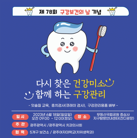 광주시와 광주시치과의사회가 주관하고 5개 자치구 보건소, 광주여자대학교(치위생학과)와 함께 하는 이날 캠페인은 ‘다시 찾은 건강미소, 함께하는 구강관리’를 슬로건으로 ▲구강관리법과 잇솔질 교육 ▲충치 검사(큐레이 검사) ▲구강용품 배부 ▲아동치과주치의 사업 홍보 등이 진행된다.