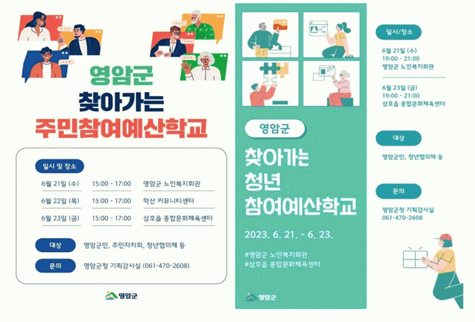 주민참여예산학교는 영암군민이면 누구나 참여할 수 있고, 자세한 교육 내용과 일정 등은 영암군청 홈페이지, 영암군 앱 ‘영암e랑’, 읍·면 행정복지센터 게시판에서 볼 수 있다.