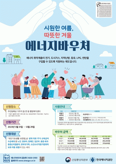 2023년 에너지바우처 지원 금액은 세대원 수에 따라 최소 149,800원(1인)부터 379,600원(4인 이상)까지 지원된다. 하절기 바우처는 7월 1일부터 9월 30일까지, 동절기 바우처는 10월 11일부터 내년 4월 30일까지 사용할 수 있다.