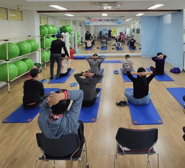 어울림 운동 교실은 장애인의 신체기능 회복을 돕는 재활 중심의 운동 프로그램이다. 재활 전문 교수가 참여해 소도구를 이용한 스트레칭과 근력 강화 운동법을 교육한다.
