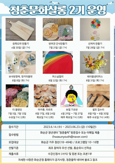 모집 대상은 18∼49세 화순군 거주 청년으로 프로그램당 10∼16명을 모집하며, 참여를 희망하는 청년은 수강신청서 및 주민등록등본 또는 초본 1부를 화순군 청년센터 “청춘들락” 사무실에 방문·접수하거나 이메일로 제출한다.