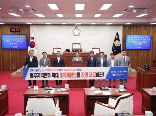 이번 성명 발표는 전남도가 오는 7월에 동부통합청사 개청을 앞두고 동부지역본부를 4개 실국, 320명 규모로 확대하는 조직개편을 추진하고 나선 데 따른 것이다.
