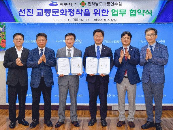 13일 시에 따르면 이날 시장실에서 정기명 여수시장과 이병희 전남교통연수원장이 참석해 여수시의 교통사고 예방과 선진 교통문화 정착을 위한 협약을 체결했다.