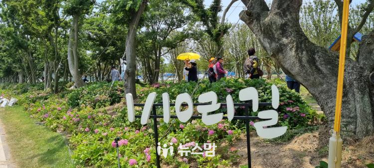 바로 옆 수국공원에는 더 많은 수국이 산등성이에 층층이 피어났다. 이번 도초도 수국축제는 문화·전시, 스탬프투어, 해시태그 이벤트 등이 함께 진행된다. 수국공원의 사이프러스 산책길엔 ‘느리게 걸으라’는 뜻으로, 횡단보도 무늬가 도로 턱 처럼 튀어나온 듯 그려놓은 트릭아트가 눈길을 끈다. 평면그림이다.