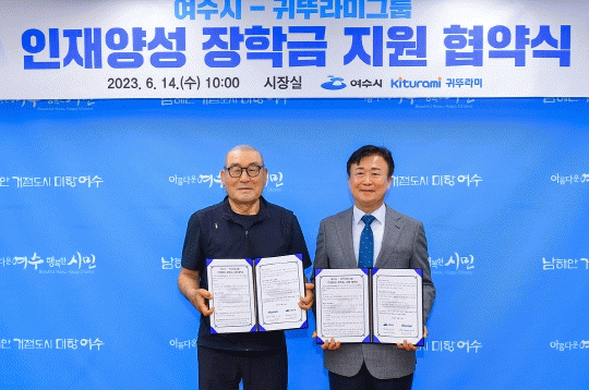 이날 오전 시장실에서 정기명 여수시장과 귀뚜라미그룹 최진민 회장 등 관계자가 참석한 가운데 ‘여수시 인재양성 장학금 지원’ 협약식을 가졌다.