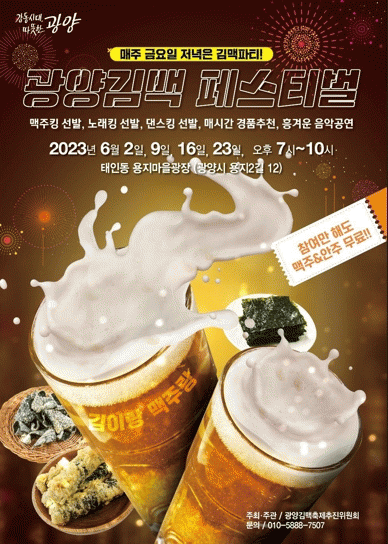 올 6월에는 김부각, 김말이 등으로 다채롭게 변주되는 김과 맥주의 페어링을 강조하는 김맥페스티벌이 매주 금요일 태인동 용지마을광장에서 오후 7시부터 펼쳐진다.