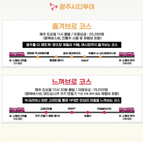‘즐겨브로’는 미식과 엠제트(MZ)세대 수요를 결합해 만든 코스이다. 양림동골목투어와 동명동 꿈브루어리에서 양조장체험을 한 뒤 광주미디어아트플랫폼 지맵(GMAP), 남도달밤야시장(미운영때 뷰폴리)을 도는 코스이다.