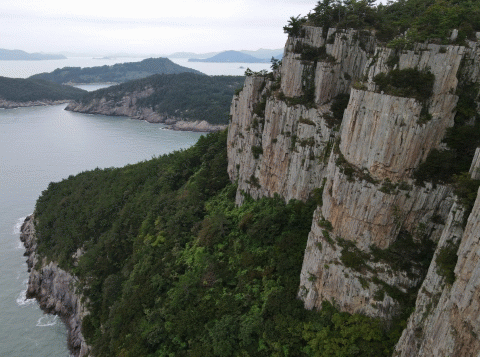 고흥 지죽도 금강죽봉은 수직절벽 높이가 100m에 달하는 웅장한 주상절리로 지질학적 가치가 높고 주변 풍광과 어우러진 빼어난 경관을 간직하고 있다.
