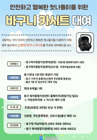 ‘신생아 바구니 카시트’는 차량 이동 시 신생아를 태울 때 반드시 필요한 육아 안전용품이다. 사용기간이 짧은 데 반해 가격 부담이 커 출산 가정의 경제적 부담 완화를 위해 광주 5개 자치구 중 유일하게 맞춤형 출산시책 사업으로 추진 중이다.