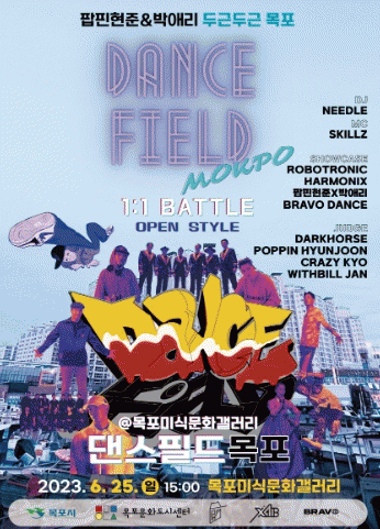 "두근 두근 목포"와의 콜라보를 통해 이루어지는 "댄스필드 목포" 대회는 1대1 개인전으로 진행하여 참가자들의 춤 실력을 겨루게 됩니다. 대회는 목포문화도시센터와 팝핀현준 유튜브 채널을 통해 6월 25일 일요일 목포미식갤러리 해관1897에서 오후 3시부터 7시까지 네 시간 동안 생방송으로 진행됩니다.