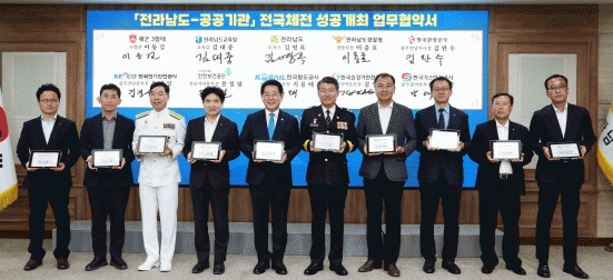 16일 도청 서재필실에서 열린 협약식에는 김영록 전라남도지사와 김대중 전라남도교육감, 이충호 전라남도경찰청장, 이동길 해군3함대 사령관 등 9개 공공기관장(지부장)이 참석했다.