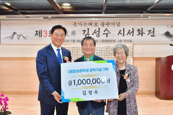 필암서원 도유사이자 (재)장성장학회 이사를 맡고 있는 김성수 선생은 그간 꾸준히 장학금 기탁을 이어왔다. 이번 기탁은 목정 선생 서화를 자서전 형식으로 묶은 책 ‘붓가는대로’ 발간을 즈음해 열린 세 번째 시서화전에서 이뤄졌다.