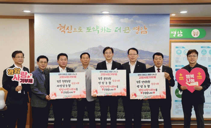 지난 15일 영암군청에서 열린 고향사랑기부제 기탁식에 임정빈 농협중앙회영암군지부장, 이광일 장흥군지부장, 박도상 영암농협조합장, 김원식 서영암농협조합장, 김외중 천관농협조합장, 김영중 안양농협조합장, 남인현 용두농협조합장 등이 참석해 농협 임직원 100여 명이 동참한 상호기부 기탁서를 교환했다.