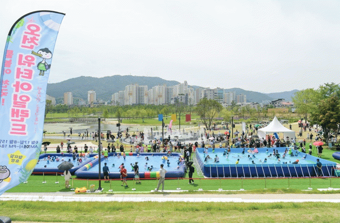 워터아일랜드는 오천그린광장 내 연면적 10,000㎡ 규모로 조성됐으며, 초대형 워터 슬라이드와 에어풀장, 그늘막 쉼터, 샤워실 등이 갖춰진 여름 맞춤형 물놀이 콘텐츠다.