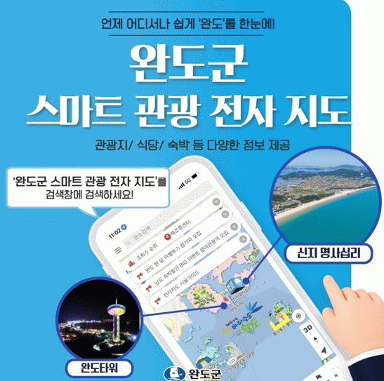 ‘스마트 관광 안내 지도’는 인터넷 주소창에 주소를 입력 또는 네이버 등 포털사이트에서 검색하거나 ‘완도군 스마트 관광 전자 지도’ 앱을 다운로드 받으면 된다.