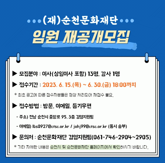 (재)순천문화재단 관계자는 “이번 임원 임명 일정이 다소 지연됐지만 재단을 이끌어갈 전문적이고 명망 있는 분들을 모시기 위해 최선을 다하겠다”라고 밝혔다.