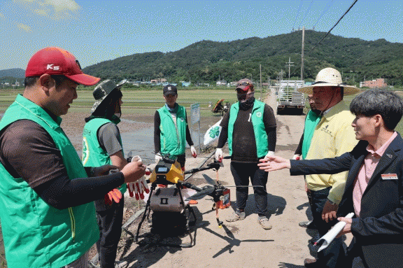 이날 모내기는 싹을 틔운 볍씨를 논에 직접 뿌리는 드론 항공 직파로 진행했는데 이는 모판 준비를 위한 약 1개월의 기간과 투입 인력을 줄일 수 있는 신기술로, 과제 답 900평 중 450평에 적용하고 나머지는 일반 이앙을 해 향후 수확 수량과 품질 등을 비교 실증할 예정이다.