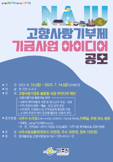 나주시는 오는 7월 14일까지 고향사랑기부제 기부금으로 조성된 고향사랑기금 사업 아이디어 공모전을 진행한다고 19일 밝혔다.