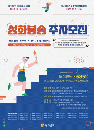 성화봉송 주자는 전남도에 거주한 만 15세 이상 도민이면 누구나 제104회 전국체전 또는 시군 누리집에서 신청서를 내려받아 작성한 후 7월 5일까지 해당 시군 체육부서에 방문, 우편이나 전자우편을 통해 제출하면 된다.