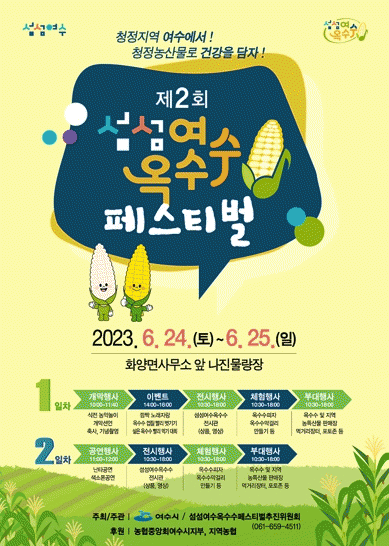 여수시가 주최하고 섬섬여수옥수수페스티벌 추진위가 주관하는 이번행사는 ‘청정지역 여수에서! 청정농산물로 건강을 담자!’ 슬로건 아래 여수시 대표 농특산물 브랜드로 육성하고 있는 ‘섬섬여수 옥수수’를 소재로 다양한 행사가 마련된다 .