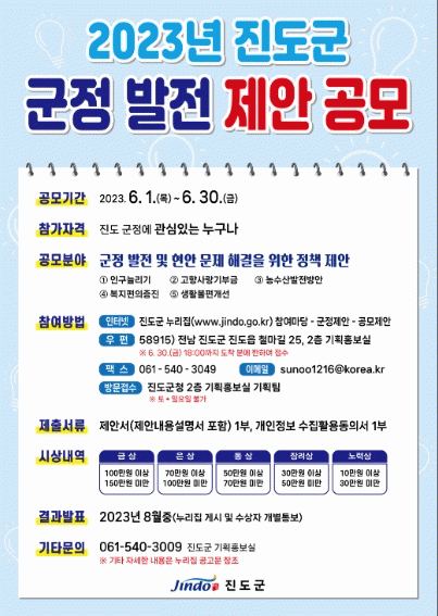 진도군 기획홍보실 관계자는 “이번 공모를 통해 참신하고 혁신적인 제안을 적극 발굴하겠다”며 “군정 발전에 관심 있는 많은 분들의 참여 바란다”고 말했다.