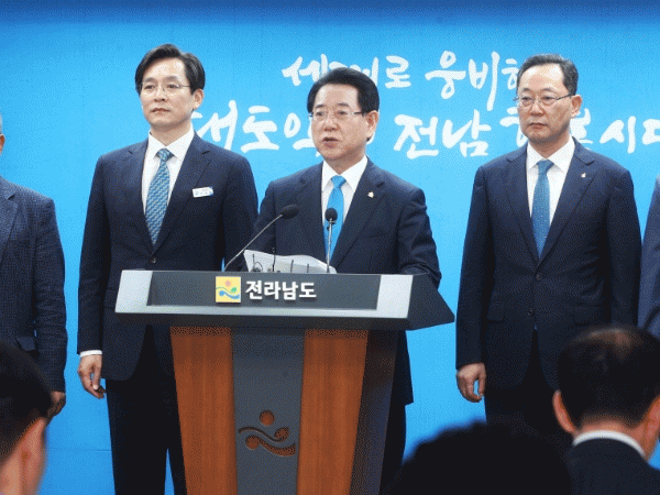 김영록 지사는 20일 도청 브리핑룸에서 명현관 해남군수, 우승희 영암군수, 고형권 보성산업㈜ 부회장, 양덕준 에이스투자㈜ 회장, 정경오 목포도시가스㈜ 대표이사 등 솔라시도 개발지구별 시행사 대표와 함께 전남 서남권 활성화를 위한 ‘솔라시도’ 기업도시 비전을 발표하고 전략과제를 발표했다.
