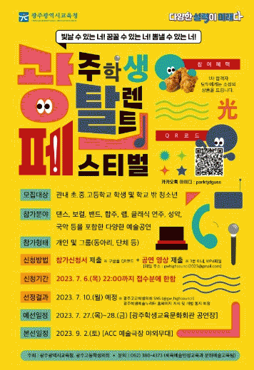 특히 광주고등학생의회가 중심이 돼 학생들이 다양한 끼와 재능을 펼치고 즐길 수 있도록 프로그램을 기획하고 진행하는 학생주도형 오디션 프로그램으로 눈길을 끌고 있다. 학생의 흥미·소질을 반영한 다양한 분야의 예술 활동 기회 제공을 통해 학생들의 활력을 높이고 자발적인 참여 중심의 예술 소통 문화를 조성하고자 한다.