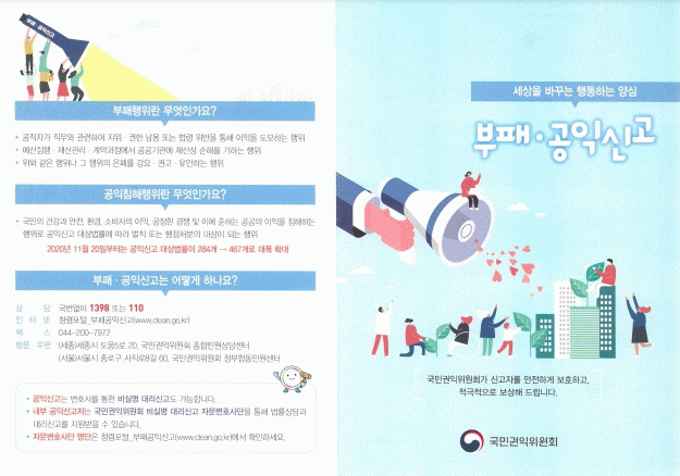 한편, 국민권익위원회는 부패·공익신고로 공공기관에 이익이 발생하면 최대 30억 원의 보상금을 신고자에게 지급하고 있다.