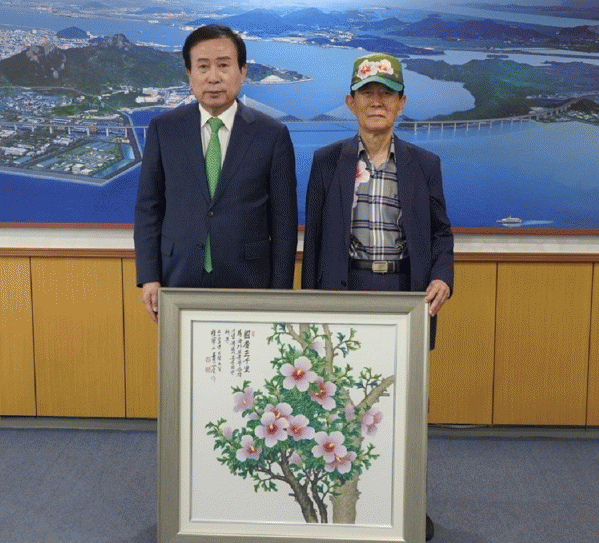 박채배 화백은 2023년 호국보훈의 달을 맞아 지난 20일 목포시청을 찾아 가로 68cm, 세로 68cm 크기(20호)로 ‘국가보훈부 승격 기념’이라는 문구가 담긴 무궁화 작품을 전달했다.